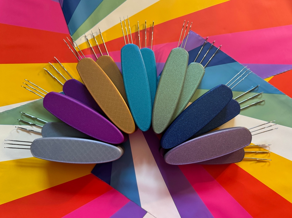 Designed by a maker, for makers. The handle is made from 3D printed plastic available in over 40 color and design options. With 3 stainless steel latch needles in the Mini and Original, 4 in the XL, 1 in Tailor and Fine Tailor, and has been designed to be comfortable to hold for long periods of time. It has a lightly textured surface so it’s easy to grip.